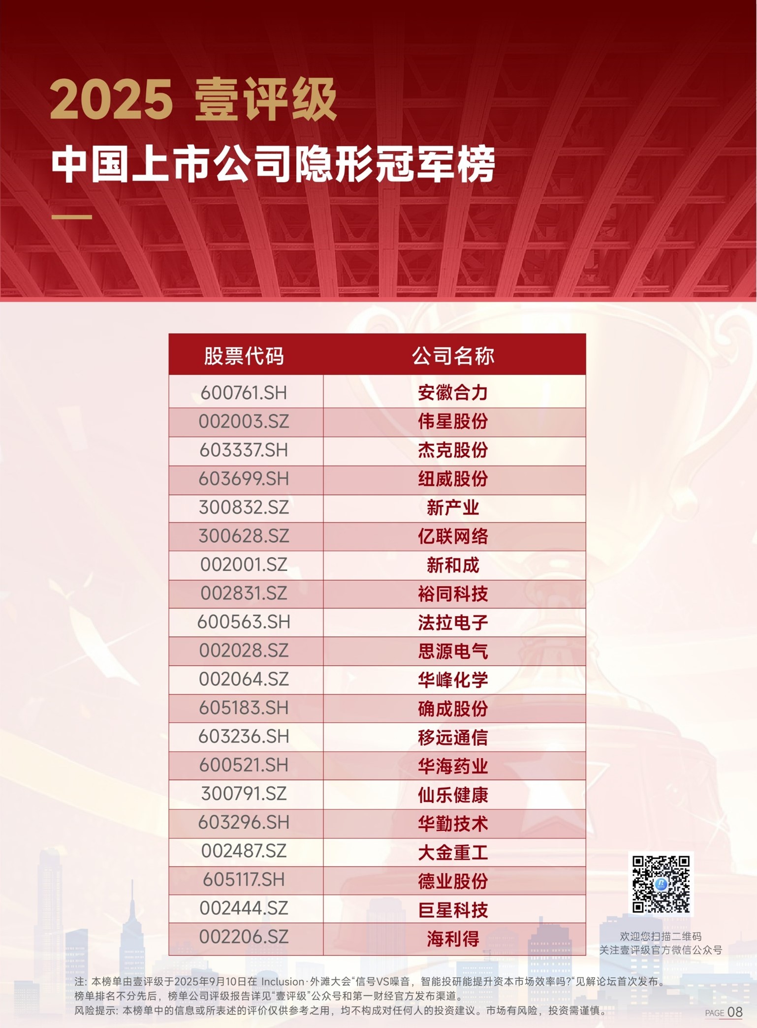 9月10日,上海广播电视台(上海文广集团)旗下第一财经发布2025年“壹评级”中国上市公司“最具护城河榜”、“最具价值榜”及“隐形冠军榜”三大榜单,同时发布首批上市公司深度研究评级报告。