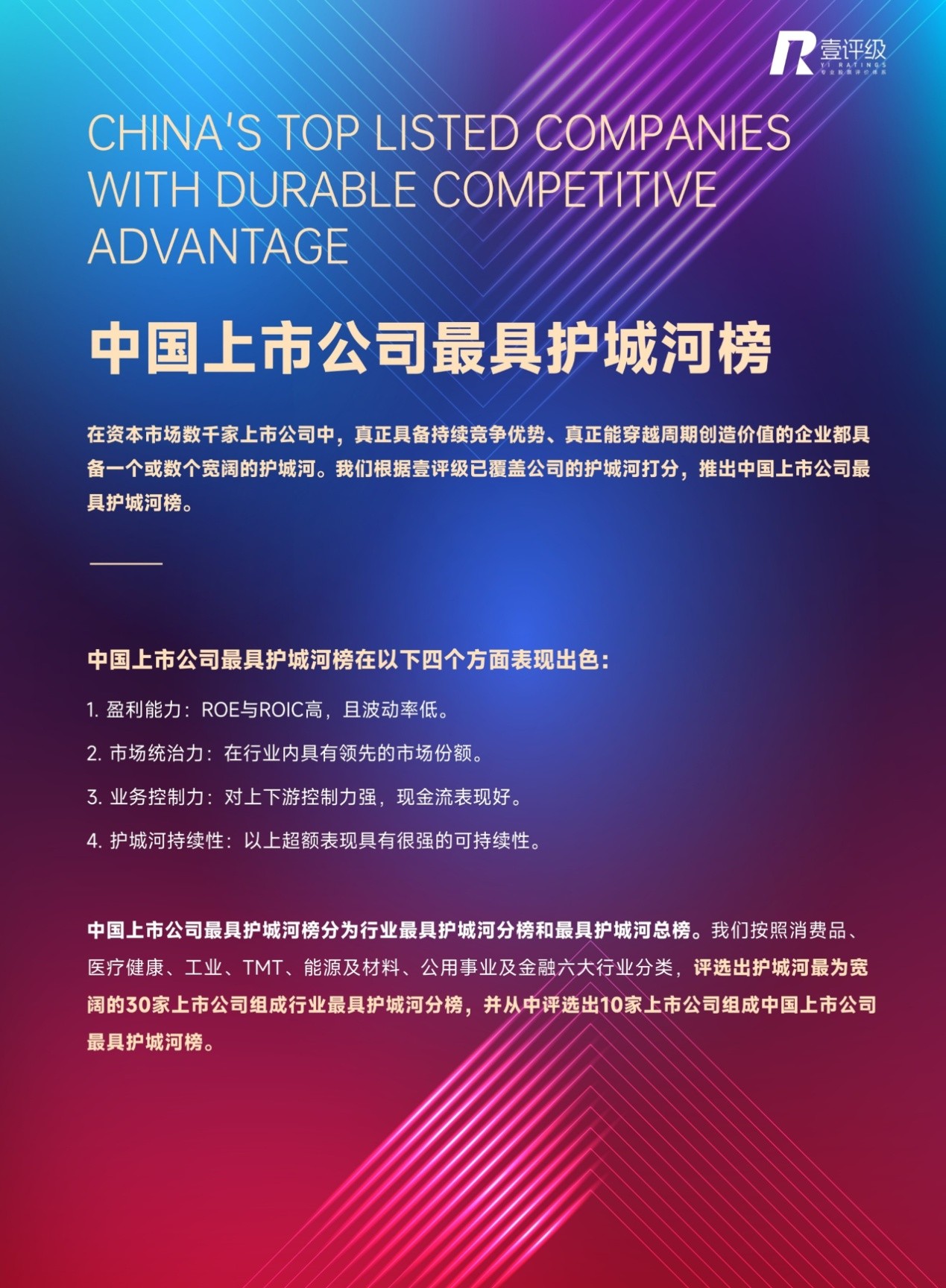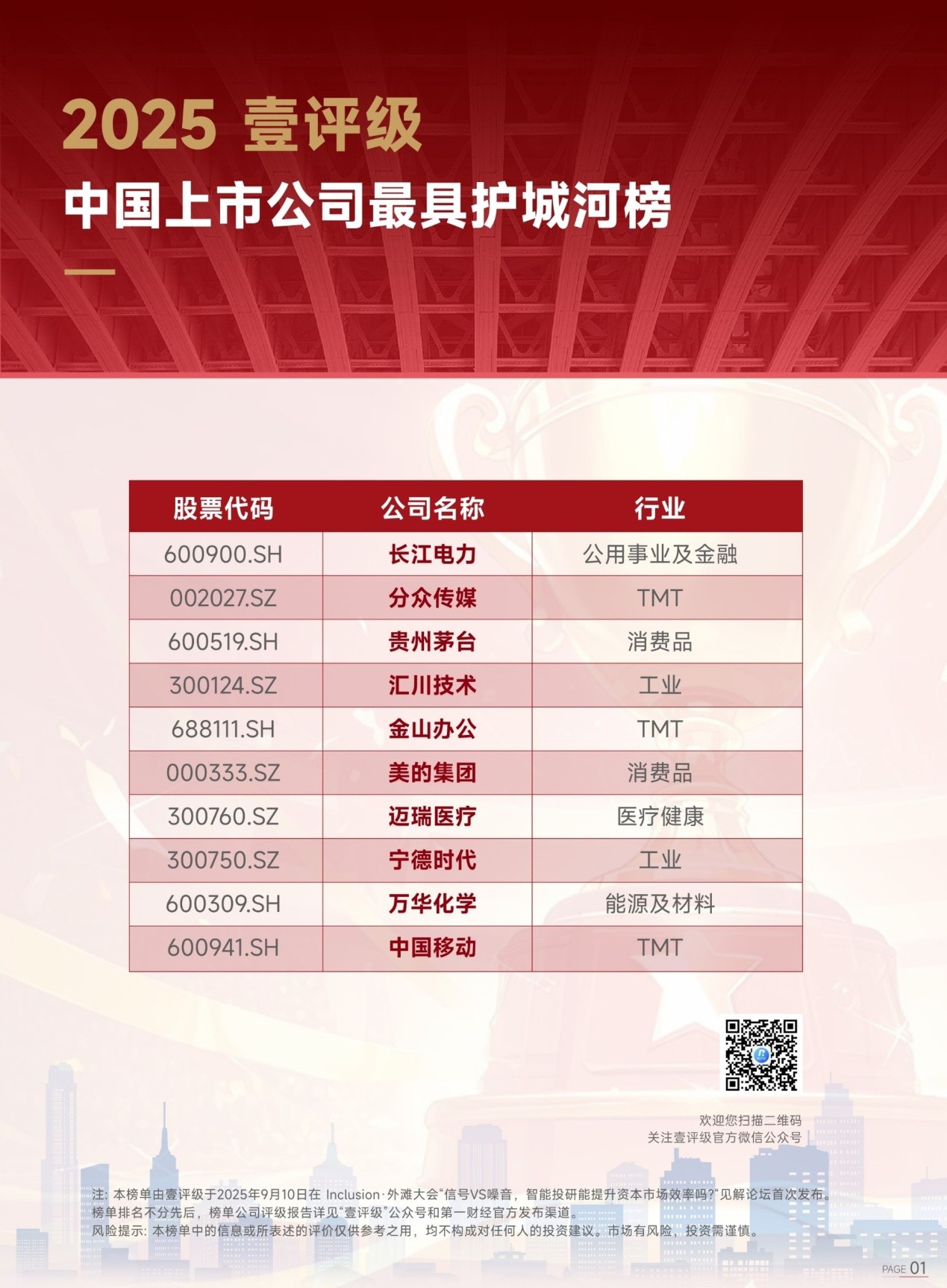 通过四维评级算法模型,“壹评级”在TMT、工业、消费、医疗健康、公用事业及金融、能源及材料六大行业选出了其中最具护城河的公司,并从优中选优的角度,在行业榜中进一步筛选了10家公司入选2025年“壹评级”中国上市公司最具护城河总榜。