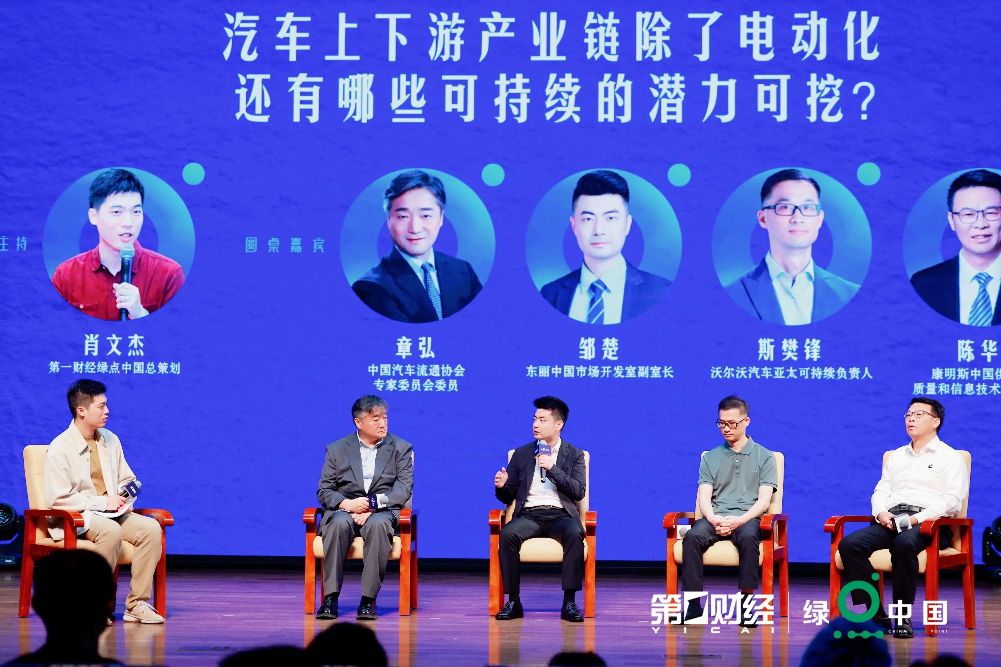 此次论坛还举办了三场行业圆桌讨论,分别聚焦不同产业的可持续发展路径。围绕汽车产业链的绿色转型,第一财经绿点中国总策划肖文杰与中国汽车流通协会专家委员会委员章弘,东丽中国市场开发室副室长邹楚,沃尔沃汽车亚太可持续负责人斯樊锋,康明斯中国供应链、质量和信息技术执行总监陈华探讨汽车上下游产业链中,除了电动化之外的可持续潜力。