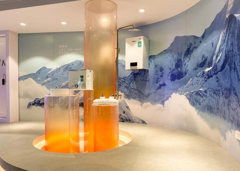 在水自在体验区,雪山背景下一束如温泉般的“水柱”令人耳目一新,其实这是威能全屋热水循环系统──eloCIRC“秒热水魔方”的概念展示。该产品与威能壁挂炉、热水器的结合将威能生活热水体验带入“零冷水”③时代。无需回水管的设计,降低了全屋“零冷水”的门槛,既减少了水资源的浪费,也带来更舒适的生活热水体验。