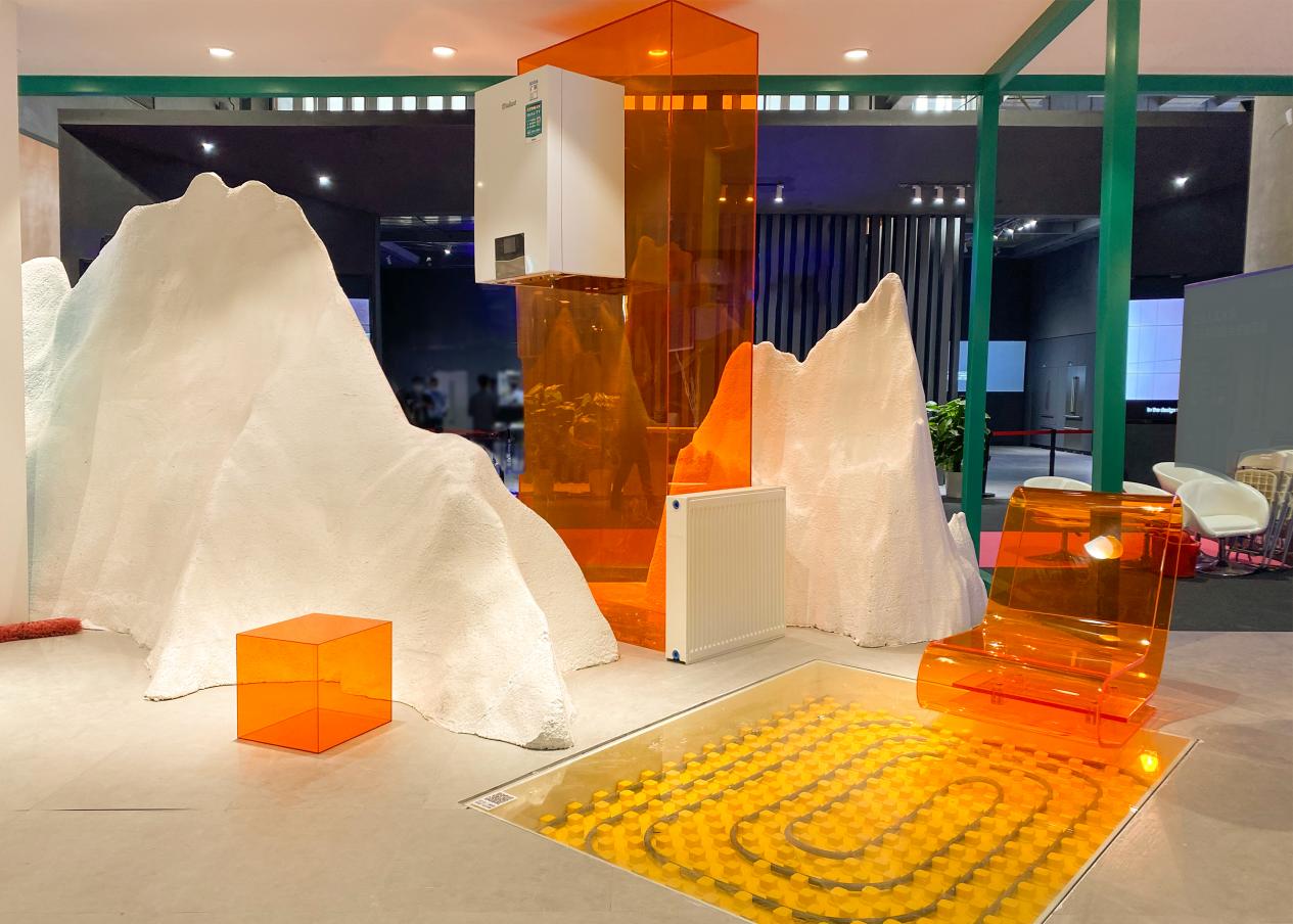 它是威能首款引入中国市场的带有Green iQ标识的产品,热效率最高可达108%,是一款真正意义上高效低排放的绿色产品,不仅满足了对生活热水有较高要求的消费者,还能减少燃气支出,节约使用费用。模拟极地冰山的展台布景搭配21℃的橙色标识,一方面代表威能强大的供暖系统,时刻为用户营造温暖体验;另一方面也再次表达“就要21度”①的主张,鼓励用户将采暖设置为21度,寻求舒适、健康与环保的平衡。