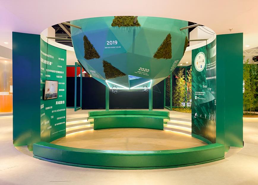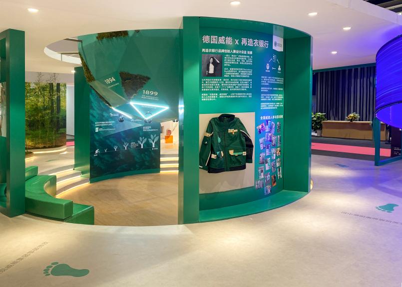 展台入口以裸眼3D大屏作为视觉锚点,吸引观展者驻足,用威能历史与“自在生活”理念向观众传递品牌信息。展台中心设置了名为“绿色新地球”巨型装置,展示威能品牌文化和发展历史,并将威能SEEDS可持续发展计划、“再造衣售后工服”展示与地球生态环境现状短片相结合,唤起人们对环境保护的关注,彰显威能秉持的“可持续发展理念”。