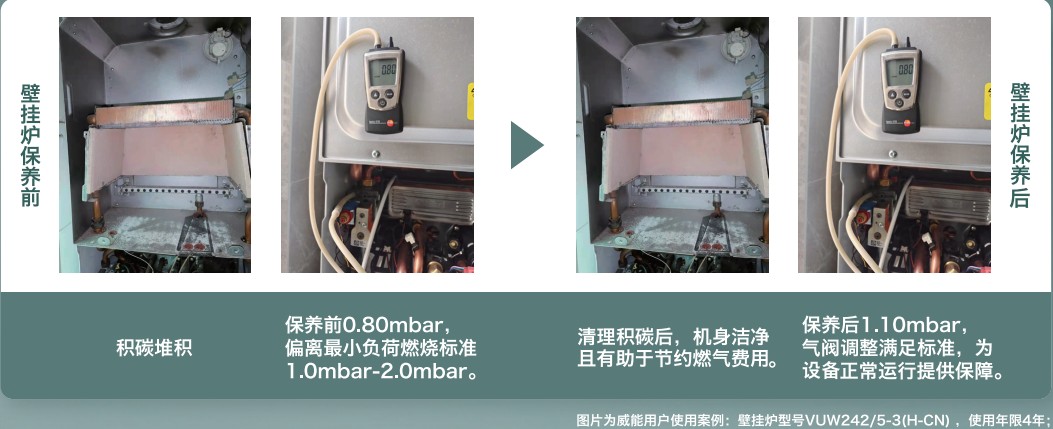 壁挂炉保养前后对比德国威能作为一家拥有自有售后服务团队的供暖品牌,在全国主要城市和地区设有服务中心,遍及全国的服务网络能确保日常维修、需求得到及时响应。以威能为例,一整套专业的壁挂炉保养服务包括设备部件保养以及采暖与热水功能检测,安全保护功能检测、气密性检测等四十余项服务。在很多用户眼中,家电只要不出故障就不用理会。其实,壁挂炉要想好用、用得久,关键是定期保养。定期清洁和更换过滤器、检查热水温度、定期检查压力、进行预防性维护以及寻求专业帮助,可以确保壁挂炉始终保持高效运行,提供稳定、可靠的热水和供暖体验。