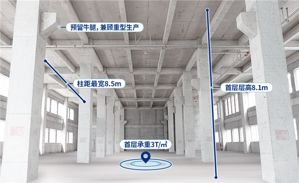 拥有多元优势的厂房能够让企业实力、实用兼得,给予企业更“高”一筹的发展体验。中建国际·青北高科园厂房首层层高8.1m,标准层高4.5m,大尺度空间规划,便于各类企业总体规划、精巧布局;柱距最宽8.5m,自由配置大型工业设备,助力产业进阶。预留牛腿,可加行车,更兼顾企业重型生产需求。