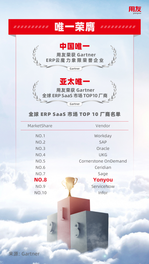 近日,全球权威信息技术研究和顾问公司Gartner发布2023年面向服务导向型企业ERP云魔力象限,用友入选荣誉企业,是唯一入选的中国厂商。此外,用友还在全球ERP SaaS市场占有率位居全球第八位,是TOP10中唯一入选的亚太厂商。