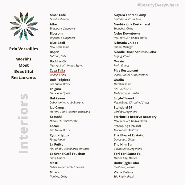 继获得联合国教科文组织(UNESCO)和国际建筑师联盟(UIA)联合颁发的“法国凡尔赛奖”之后,刘昊威/ CAA建筑事务所作品CASA TALIA餐厅在近日又被该奖项评为了“世界最美餐厅”。 该项目作品自建成使用以来,已获得数十个重要国际奖项。